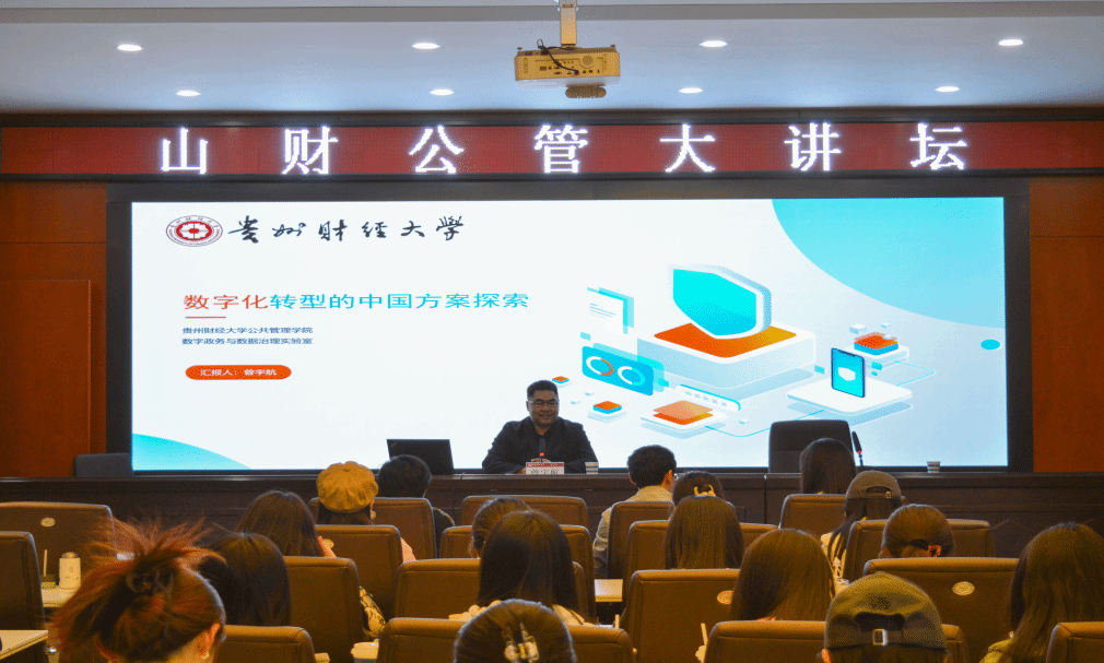 曾宇航教授做客山财公管大讲坛,做了主题为“数字化转型的中国方案探索”的精彩学术报告。院长郭淑芬教授主持了报告会,学院近百名师生聆听了报告。