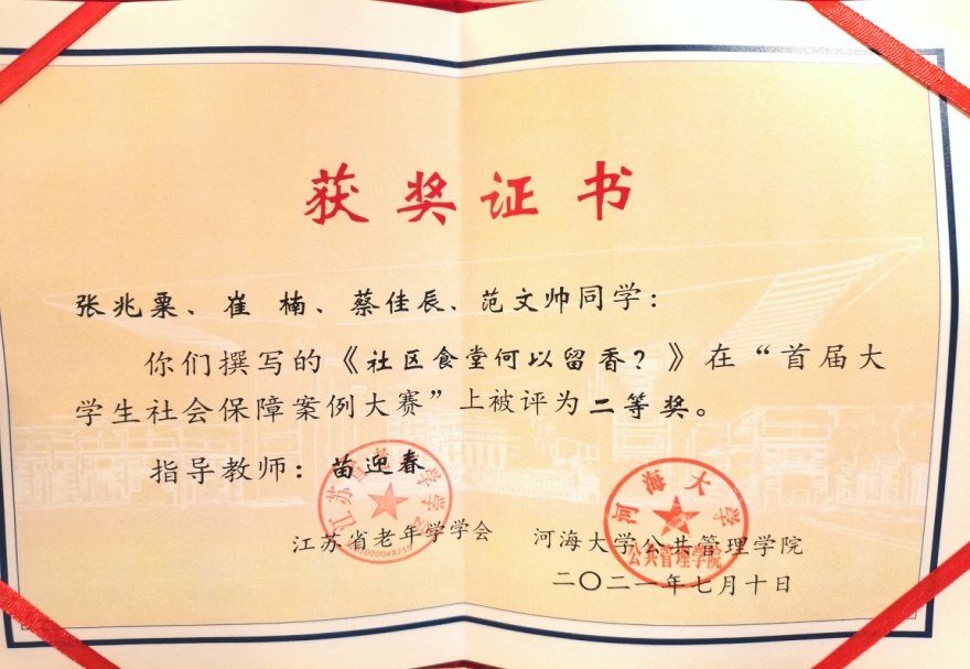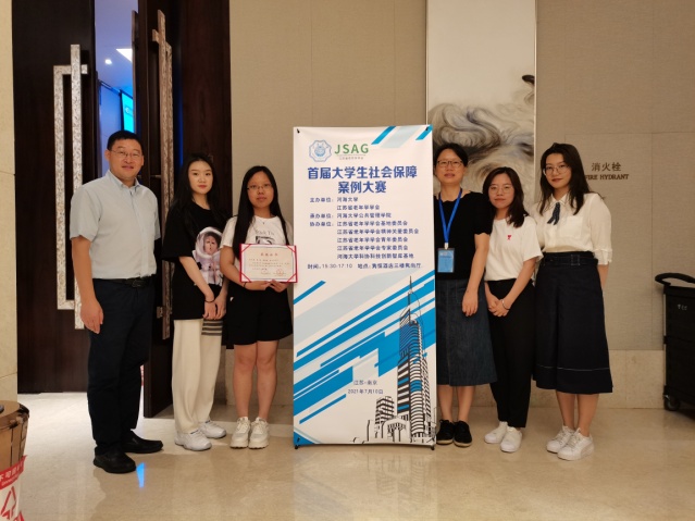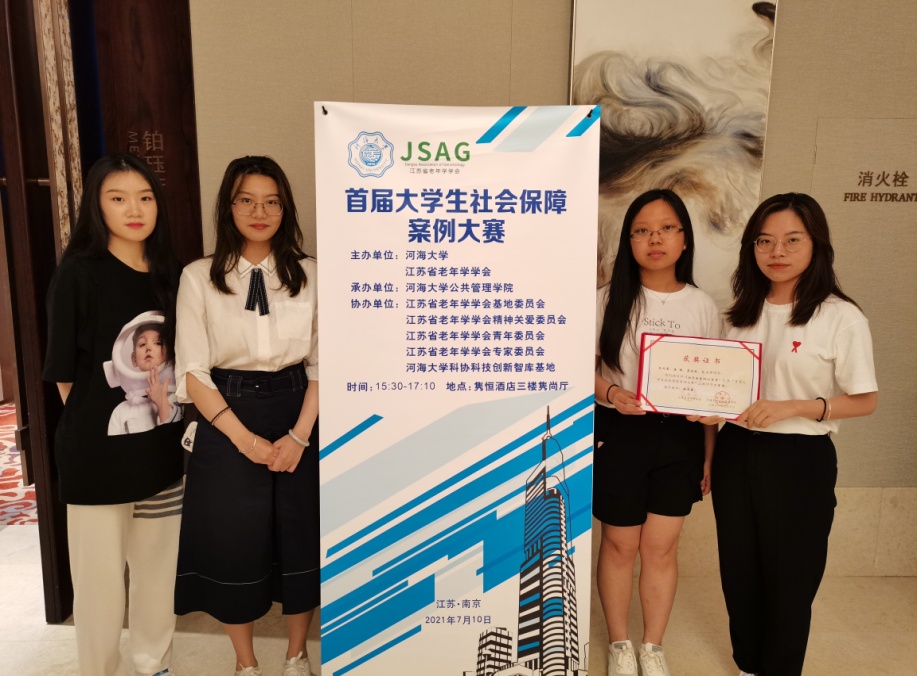 7月10日,由江苏省老年学学会、河海大学主办,河海大学小宝影院 承办的“首届大学生社会保障案例大赛”颁奖大会,在十朝都会、人杰地灵的江苏省南京市隆重举行,小宝影院 苗迎春老师指导的2020级社会保障研究生团队荣获二等奖,团队成员张兆粟、崔楠、蔡佳辰、范文帅赴宁参加颁奖典礼。