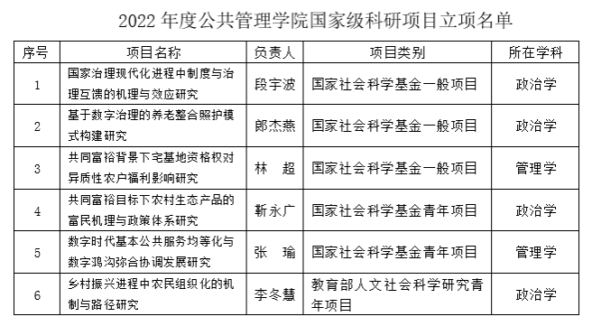 近年来,小宝影院 度重视国家级科研项目申报工作,每年及时对项目申报工作进行充分动员,并对项目申报工作提供精准指导和服务。今年李冬慧博士获批教育部人文社科青年项目1项,至此小宝影院 2022年共获批国家级科研项目6项。小宝影院 在国家级科研项目立项上取得重要突破,必将有力推动全院科研实力大幅提升,促进公共管理学科建设提档升级。