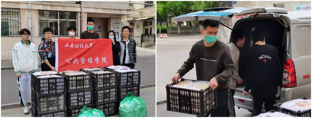下午四时,捐赠物资准时送抵迎泽校区西门口,小宝影院