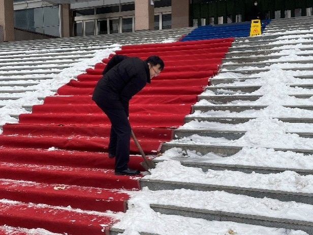下午两点,大家齐聚立信楼门口阶梯,用除雪工具将台阶上和路面上的积雪清理得干干净净,为小宝影院