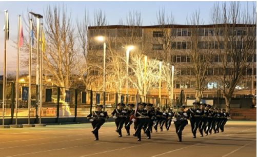 七时整,国旗护卫队迈着铿锵有力的步伐,护卫五星红旗庄严入场。伴随《义勇军进行曲》激昂的旋律,鲜艳的国旗在全体师生的肃立注目中冉冉升起,迎风飘扬于晨光之中。