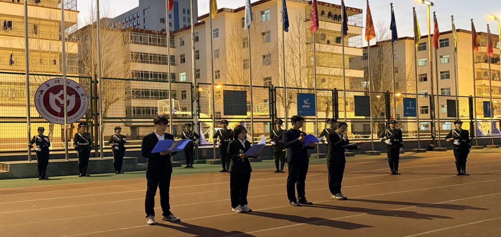 于坞城校区操场隆重举行升旗仪式。学院领导、全体辅导员及在校生共同参与,仪式由2023级劳动与社会保障班武悦同学主持。